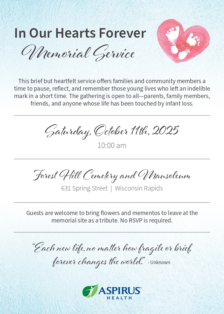 WISCONSIN RAPIDS, Wis. – The community is invited to come together for a special memorial service, In Our Hearts Forever, to honor and remember the lives of babies lost too soon. The service will be held on Saturday, October 11th, 2025, at 10:00am at Forest Hill Cemetery and Mausoleum, located at 631 Spring Street, Wisconsin Rapids.