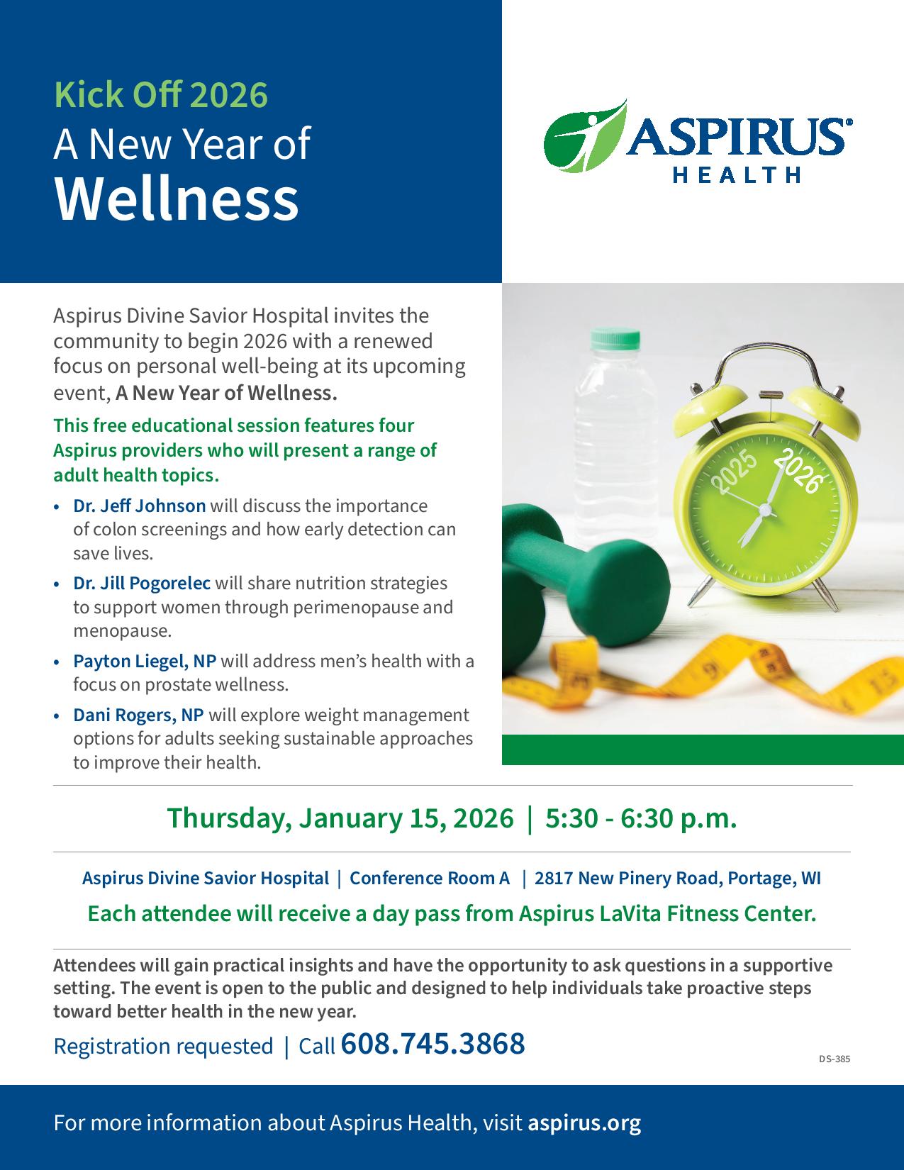 Aspirus Divine Savior Hospital invites the community to begin 2026 with a renewed focus on personal well-being at its upcoming event, A New Year of Wellness. The event will take place on Wednesday, January 15, 2026, from 5:30 to 6:30 p.m. at Aspirus Divine Savior Hospital, Entrance A, Lower Level Conference Room A.
