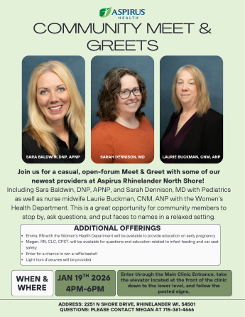 The casual, open-house style event will take place Monday, January 19, from 4 - 6 p.m. at the Aspirus Rhinelander Clinic – N Shore Drive, located at 2251 N. Shore Drive. Community members are invited to stop in, meet providers face-to-face, and connect with the care team in a relaxed, friendly environment.