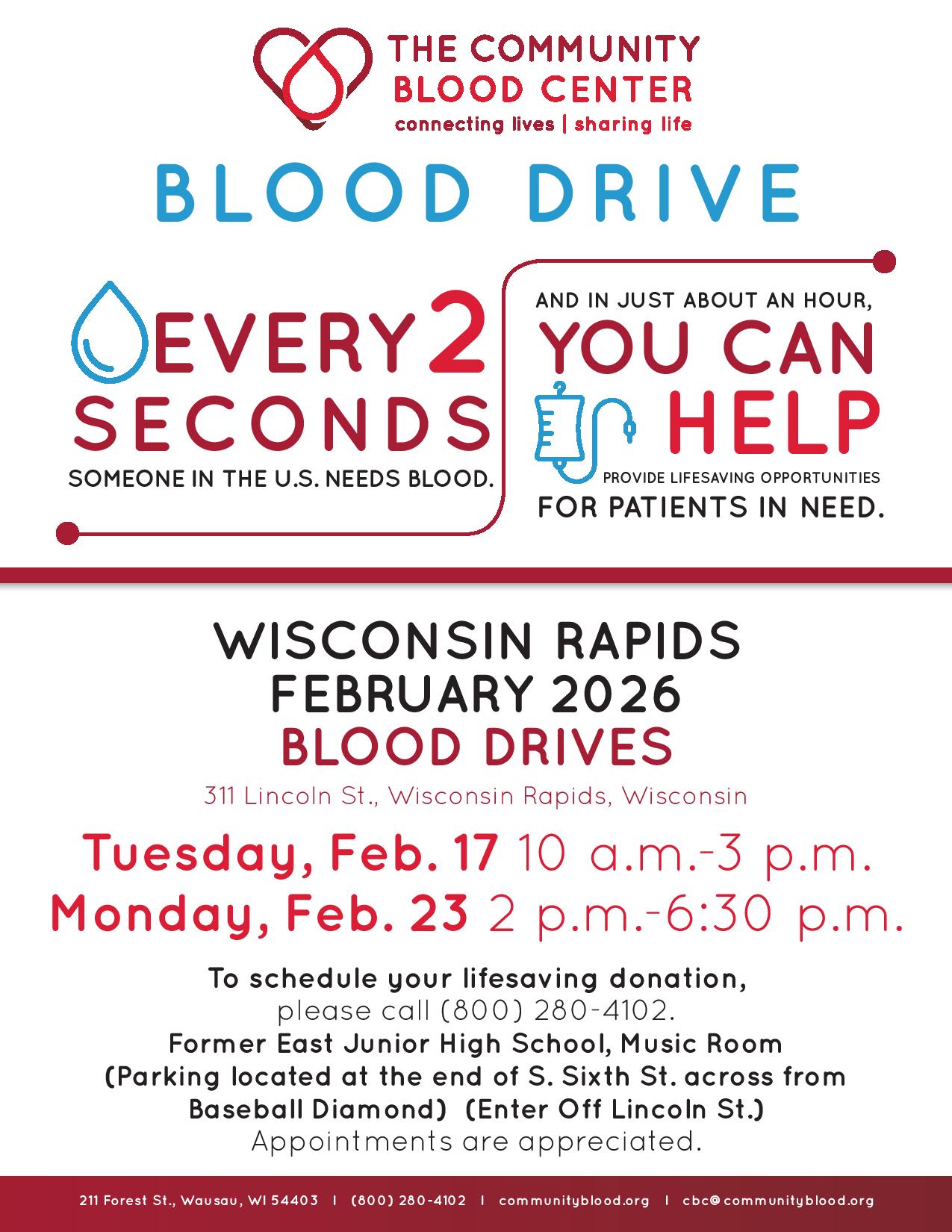 Tuesday, February 17th 10am-3pm Monday, February 23rd 2pm-6:30pm Located on 311 Lincoln Street, Wisconsin Rapids, Wisconsin in the former East Junior High School, Music Room. Par...